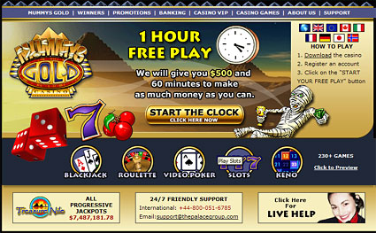 | Mummys Gold Online Casino Mummys Gold Online Casino offers 500 free casino money and one hour free play to make as much you can. | Mummys Gold Online Casino Latest Offer - 500 Free and 1 hour to make as much cash as you can! Mummys Gold Online Casino Introduction With a very experience team behind it Mummy’s Gold online Casino is one of the most charismatic internet casinos today. Mummy’s Gold online Casino has a classical Egyptian feel to it and is known amongst players for offering some of the highest payouts in online gaming industry. Progressive Jackpots regularly reach the $2,000,000 mark, and given the theme of the casino ‘Treasure Nile’, a progressive slot that can payout well in excess of $100,000, is a brand favourite amongst players looking to win big. Mummys Gold Online Casino Home Page Visit Mummys Gold Online Casino Now! It is not just Progressive slots than offer the big payouts, however. In total there are over 290 games for players to sample, all of which capable of paying out some of the biggest and impressive jackpots. Every conceivable genre of game is to be found at the site including several multiple variations of Video Poker, Blackjack, five and three reel video Slots, Roulette, Craps and many more. Mummy’s Gold is powered by Microgaming. This means that players enjoy the most advanced graphics, sound and usability that combine to give them the best possible gaming experience. Mummys Gold Online casino is perfect for experienced and new players alike, and players can play all the games for free before playing for real or they can try the latest casino offer of 500 free and one hour of free gaming to make as much cash as they can. Furthermore, the excellent customer service teams are at hand 24 hours a day, seven days a week should you run into any problems. There are a wide range of deposit and withdrawal options for players to use including Credit Card, Neteller, Firepay and a host of others, and the there are four playing currencies available – US $, Canadian $, British £’s and Euros €’s. The casino is licensed in Kahnawake, Canada. And owned by the same group that own one of the biggest and most popular online casinos Spin Palace Online Casino Visit Mummys Gold Online Casino Now! MUMMYS GOLD ONLINE CASINO |